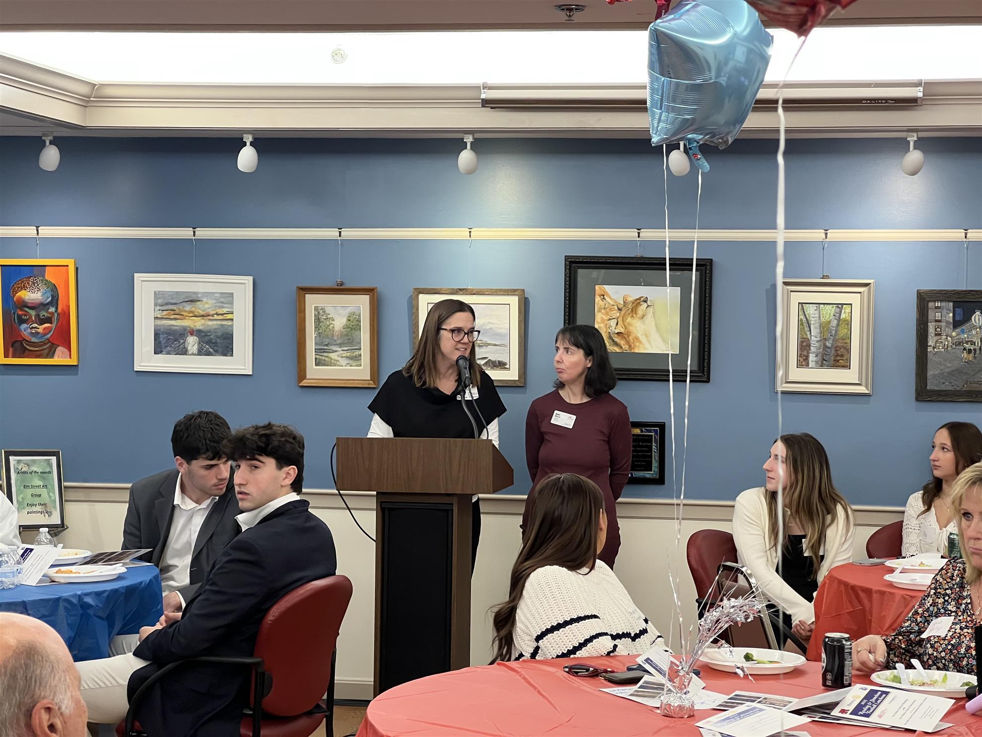 Rotarian Steven Rotondi, also of the Stoneham Historical Society, gave a short speech to display a piece of the Reading High goal post from the 1941 game. Stoneham won that game and students returned to the field to take the goal post as a trophy. The theft sparked a chase around the streets of Stoneham.
